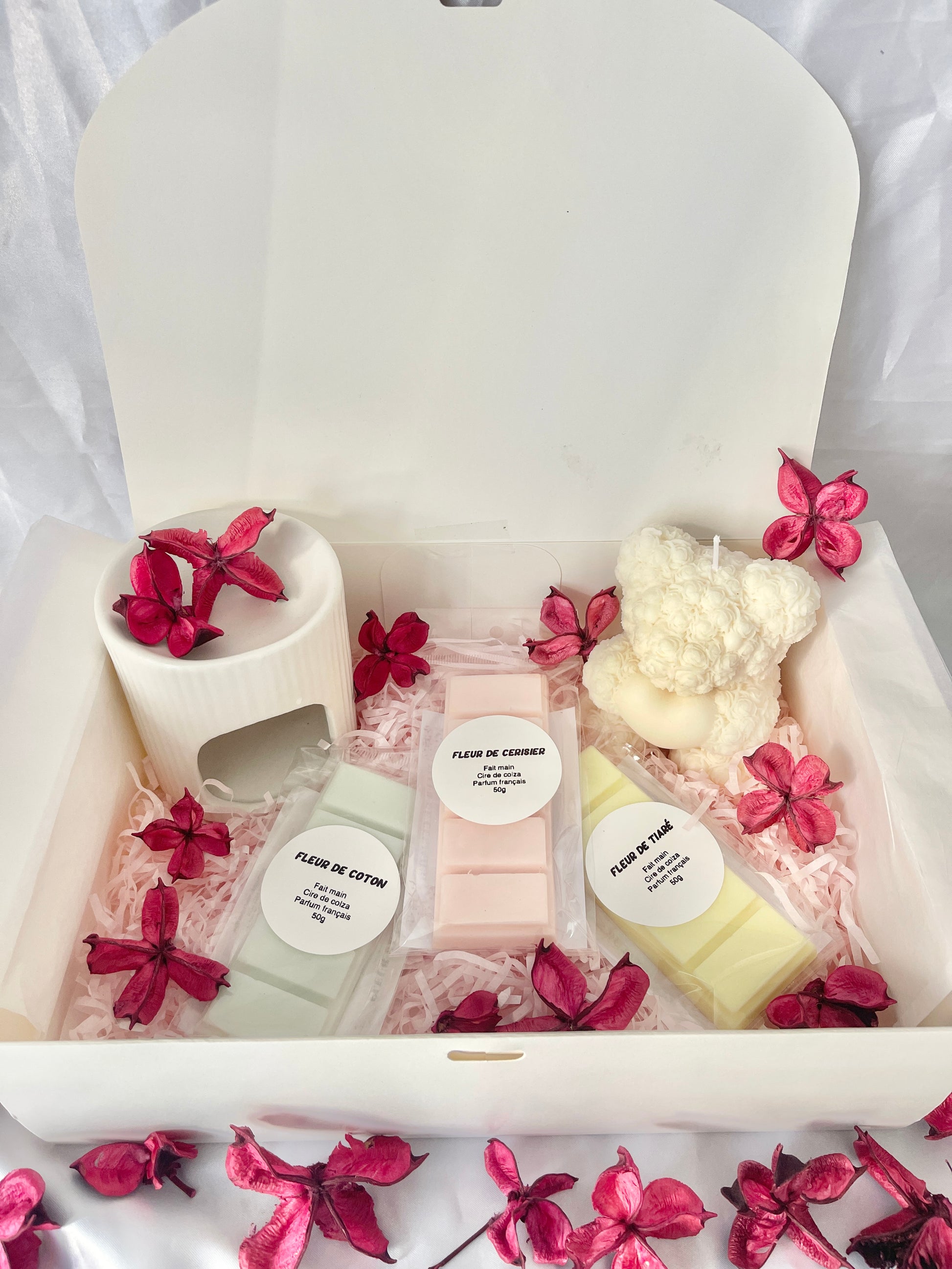 Dans ce coffret, vous retrouverez : 1 brûleur, 1 sculpture bougie (non parfumée) et 3 fondants Snapbar senteur fleur de cerisier, fleur de tiaré et fleur de coton, et 2 chauffes-plats vous seront offert.