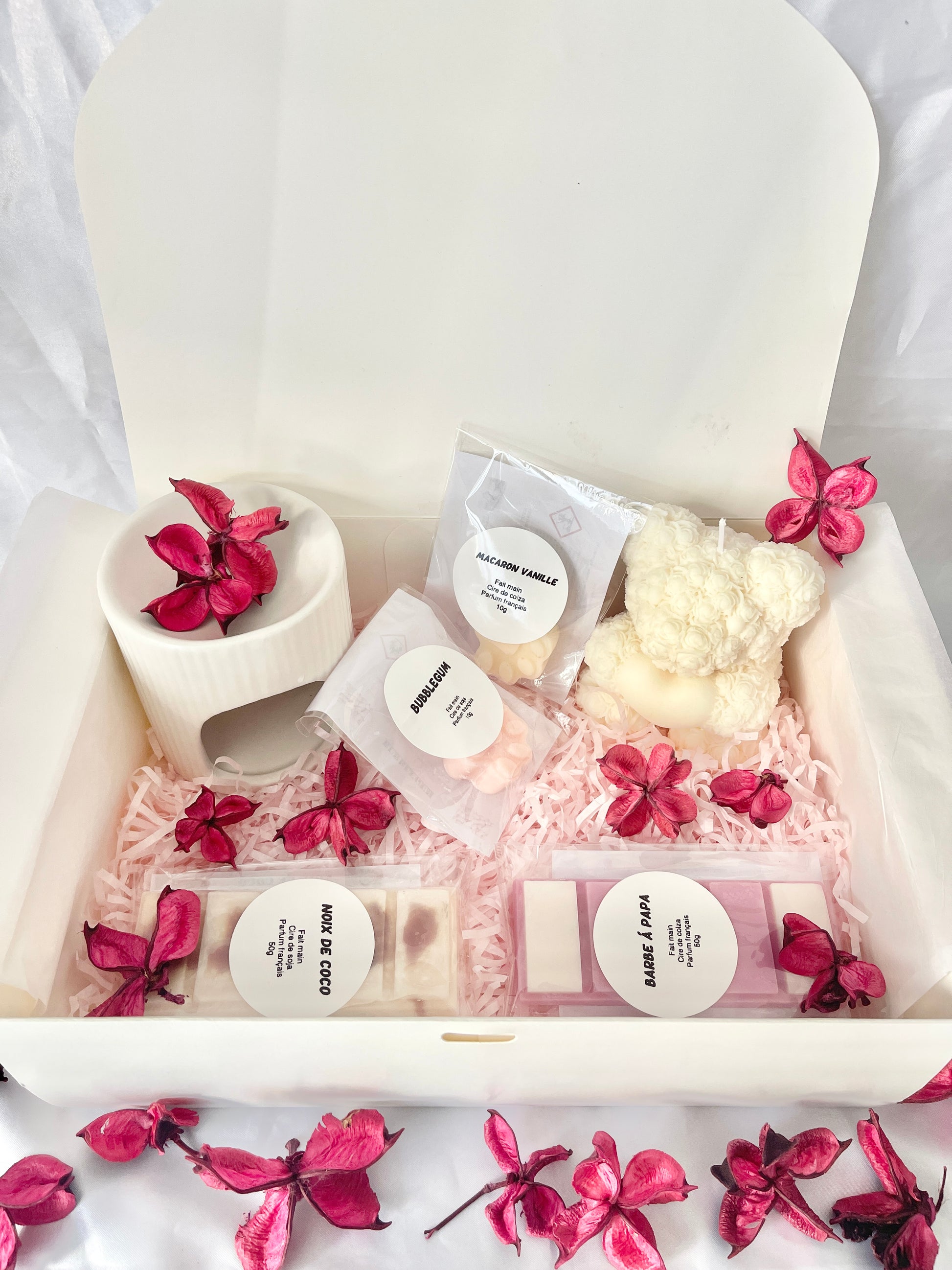 🦋 Dans ce coffret, vous retrouverez : 1 brûleur (choix dans la liste et photo du diaporama), 1 sculpture bougie (non parfumée), 2 fondants Snapbars senteur barbe à papa et noix de coco et 2 fondants patte de chat senteur macaron vanille et bubblegum et 2 chauffes-plats vous seront offert.